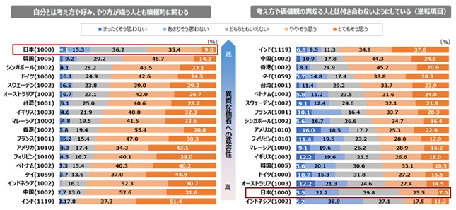 1. 異質な他者への寛容性をみると、「自分とは考え方や好み、やり方が違う人とも積極的に関わる」は、日本で最も非寛容な回答が多かった一方、「考え方や価値観の異なる人とは付き合わないようにしている(肯定ほど非寛容)」は、インドネシアに次いで2番目に寛容な回答が多かった。日本は、異質な他者と積極的に関わろうとはしないが、進んで付き合いを避けることもしないという特徴がうかがえる。