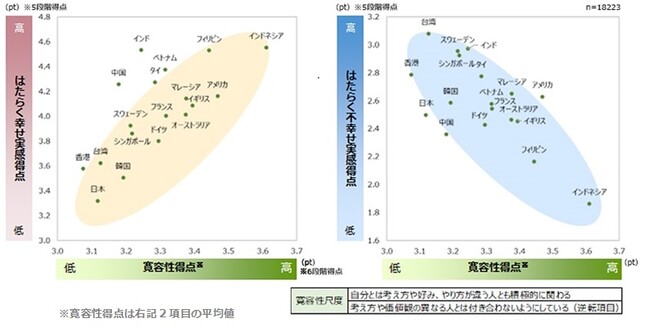 日本の就業者の寛容性※3は18カ国・地域で2番目に低く、はたらく幸せ実感の低さと関連