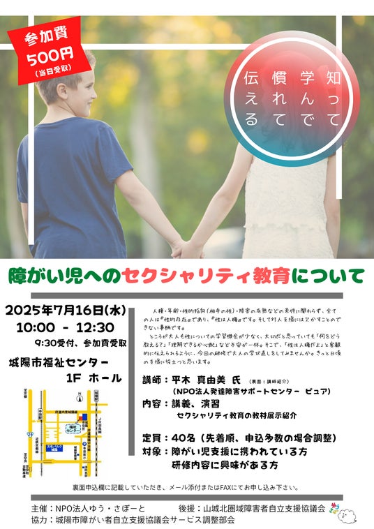 NPO法人ゆう・さぽーと(所在地:京都府城陽市)は、2025年7月16日(水)に、京都府南部地域の障がい児支援に携わる職員の皆様を対象とした研修会「障がい児へのセクシャリティ教育について」を城陽市福祉センターにて開催いたします。本研修では、講師に平木真由美氏(NPO法人発達障害サポートセンター ピュア)をお迎えし、障がいのある子どもたちへのセクシャリティ教育の重要性とその具体的な方法について、講義と演習を通じて深く学びます。日々の支援に役立つ実践的な学びの機会として、皆様のご参加をお待ちしております。