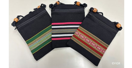 黒地にカラフルな縞模様が印象的なポシェットは、ベトナム中部山岳地に暮らす少数民族の女性たちの伝統衣装の織物で作られている。織物は少数民族の豊かな伝統文化の一つだが、近代化の波の中で継承が困難になっていた。収入源としての可能性を見出したFIDRが、15年にわたり技術指導、製品化やマーケティングなどの支援を行ったことにより、今ではベトナム国内を中心に安定的な販売が実現している。2014年には、ベトナムの無形文化遺産に認定された。若い世代への技術継承も進み、少数民族が伝統文化への誇りを取り戻す契機となった。