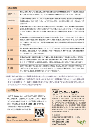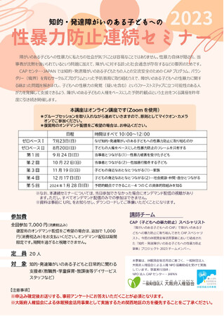 CAPセンター・JAPANでは知的・発達障がいのある子どもたちが豊かに人と関わるためのCAPプログラム、境界線(バウンダリー)を育むサークルズプログラムといった予防教育に取り組むうえで、性暴力に関する絡まった問題を解きほぐし、子どもへの性暴力の発覚(疑いを含む)というファーストステップに立つ可能性のある人が力を発揮して支援できるよう、障がいのある子どもの人権をベースにした予防的観点という土台をつくる講座です。
