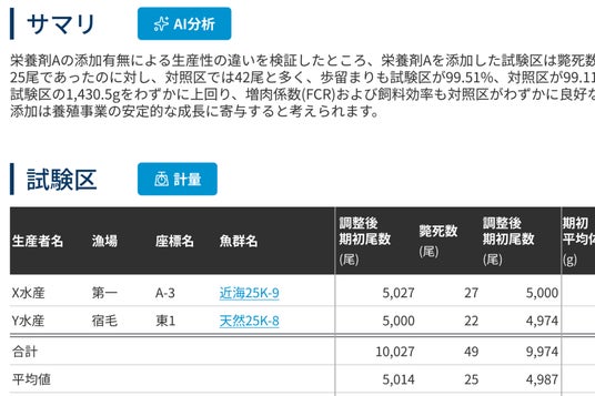 効果検証。試験区や対照区ごとの生産性を横断的に比較し、AIが自動で分析します。