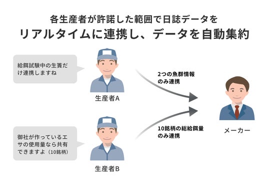 メーカーは紙や電話などで生産者とやりとりしていた最新の日誌データをリアルタイムに自動収集でき、開発・製造・販売などの業務にデータを活用できるようになります。