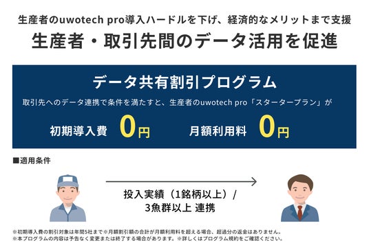 メーカーのデータ活用には生産者が「uwotech pro」を利用している必要があります。まだ導入していない生産者の導入ハードルを下げ、メーカーへのデータ共有を後押しするため、2026年12月31日までデータ共有を条件とした「uwotech pro」の初期導入費・月額利用料の一部を割引する「データ共有割引プログラム」を実施します。