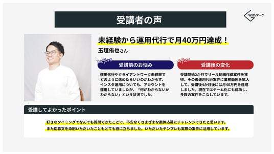 Instagram未経験から、受講開始4ヶ月で月40万の収益を達成、法人化に成功された受講生です。