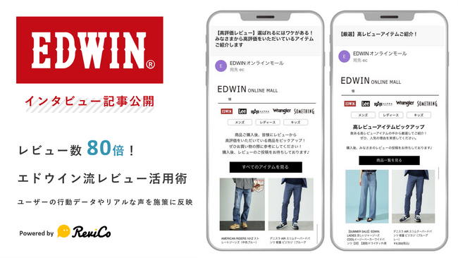 株式会社エドウイン(本社:東京都品川区、代表取締役社長:俵 修一)は、同社が運営する直営公式オンラインショップ「EDWINオンラインモール」に、株式会社ReviCo(レビコ、本社:東京都渋谷区、代表取締役:高橋 直樹)が運営するレビューマーケティングプラットフォーム「ReviCo」を導入し、レビュー数80倍を達成しました。
