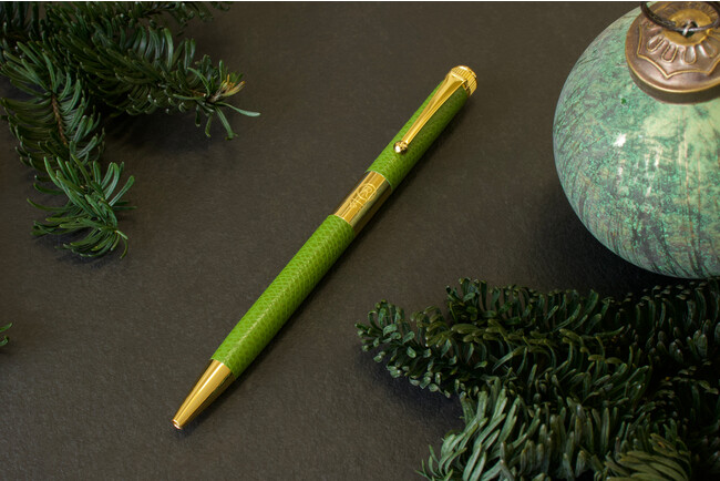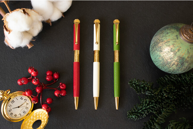 上品な輝きを生み出すゴールドのボディにエレガントなレザーの高級感を纏った華やかなNo.3 ES(エクストラスリム)。季節を象徴するカラー、赤・白・緑のレザーとゴールドの組み合わせが手元を華やかに彩り、 やわらかく手に馴染むグリップが安定した筆記を叶えます。繊細なシボのテクスチャーが施された本革が丁寧に巻かれたスリムな金属軸ボディの天冠には 清らかな純白の雪を思わせるホワイトカラーのアクリルパーツをあしらいました。