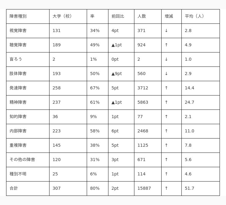 ・障害学生の在籍がある大学は307校に達し、回答数の80%で前回比2ポイント増えています。在籍者の総数が1万5千人を超えました。また、障害学生が在籍する一大学あたりの障害学生の数が、平均51.7人であり、前回調査と比べさらに増えました。