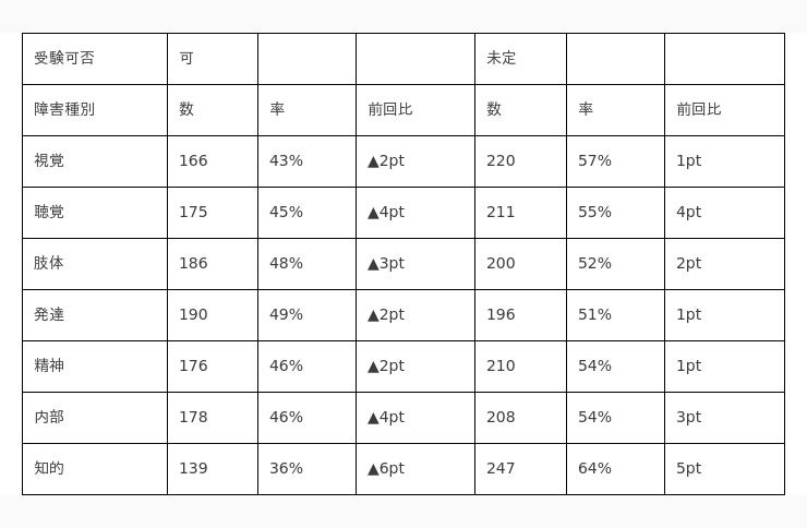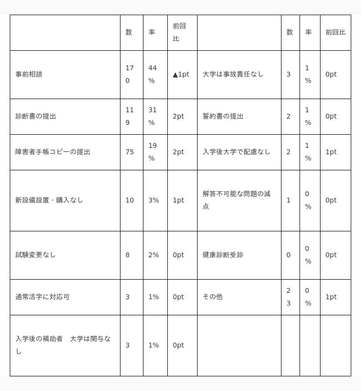 ・受験時配慮の調査結果では、視覚障害・聴覚障害・肢体障害・発達障害で前回比とほんほとんど変化が見られませんでした。