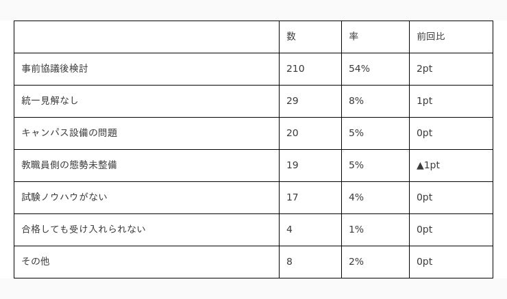 ・「統一した見解がまとまっていない」「設備に問題」「試験のノウハウなし」と続きます。