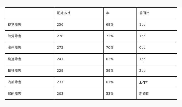 ・内部障害については「配慮あり」が前回比で2ポイント減少しました。