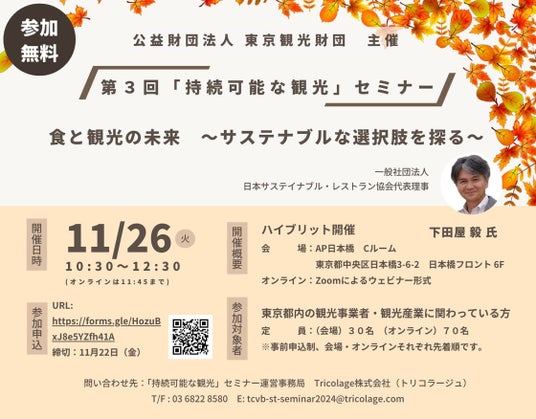 Tricolage(株)は、東京都及び(公財)東京観光財団が実施する「持続可能な観光」の推進に関する国際的な認証等について学ぶ第3回セミナーを運営します