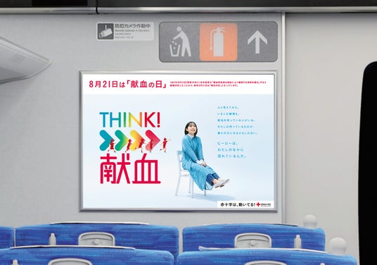 8月1日(木)から8月31日(土)1ヶ月間、普通車全車両に掲出されます。 「THINK!献血」のメインポスターを活用し、「献血の日」の由来を伝えるメッセージも掲載しました。