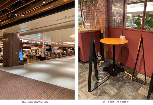 都内、TSUTAYA BOOKSTORE 恵比寿ガーデンプレイス店内「SHARE LOUNGE」にて寄りかかり休憩スタンド(Tall/Short)とAdjustable Tableをご体験頂けます。