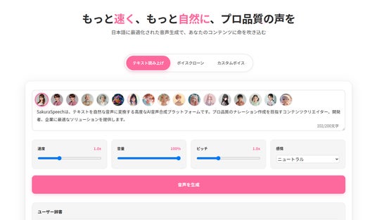 「SakuraSpeech」は、日本語特有のアクセントやイントネーション、漢字の読み分けといった課題に対応し、日本語テキストをそのまま音声として使える品質を目指して設計されたAI音声生成プラットフォームです。