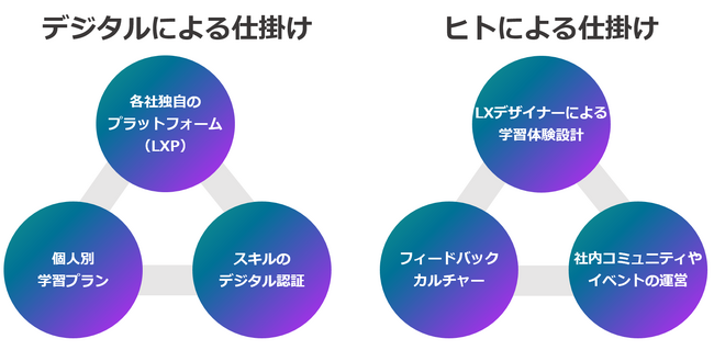 「デジタルの仕掛け」としては、各社独自のLXP(Learning Experience Platform)やブロックチェーンを活用したスキルを可視化するデジタル証明書などを充実させている企業が多く見られます。