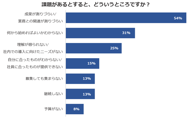 半数以上の企業が、リスキリングに対して「成果が測りずらい・業務との関連が測りずらい(54%)」と感じており、他には、「制度の調整や社内調整に時間がかかる」、「何から始めたらいいかわからない」、「社員に合ったものを提供できない」、「事務局で管理できない」などの声も見られました。