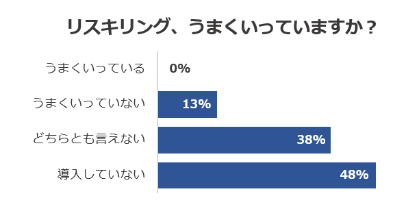 「リスキリングうまくいってますか?」に対して、「うまくいっている」と回答した企業は1社もなく0%という結果となり、導入しているほとんどの企業は「うまくいっていない(13%)」や「どちらともいえない(38%)」と感じていることがわかりました。