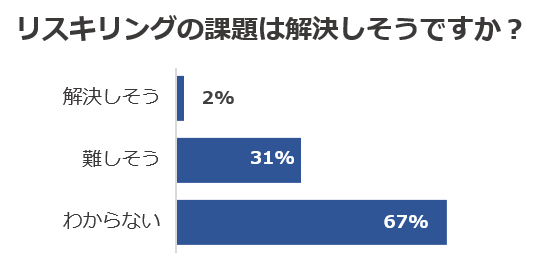リスキリング施策の課題に対して、「解決しそう」と感じている企業は2%と少なく、ほとんどの企業は、「むずかしい・今の時点だとわからない」と対策に悩む企業がほとんどという結果となりました。