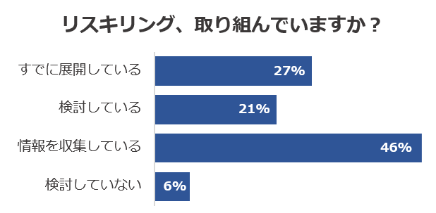 リスキリングについて何らかを実施している企業が93%となり、そのうち「リスキリングに関する情報を収集している」企業が46%と最も多く、次いで「リスキリング施策をすでに展開している」が27%、「リスキリング施策を検討中である」が21%という結果になりました。