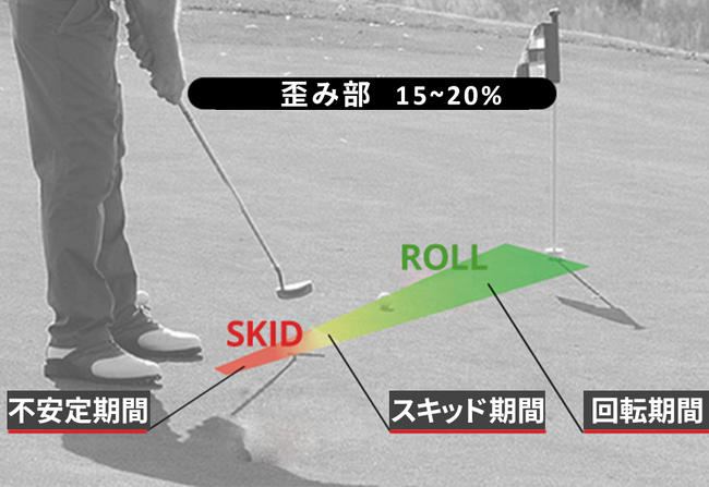 一般的なパターではインパクト後、ボールは跳ねて着地した後に転がり始めます。