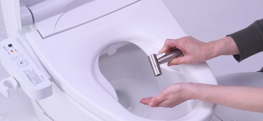 温水ハンドシャワー機能内蔵でオストメイトの方のパウチ洗浄や要介護者の陰部洗浄やトイレ内のお掃除にご活用いただける機能となります。