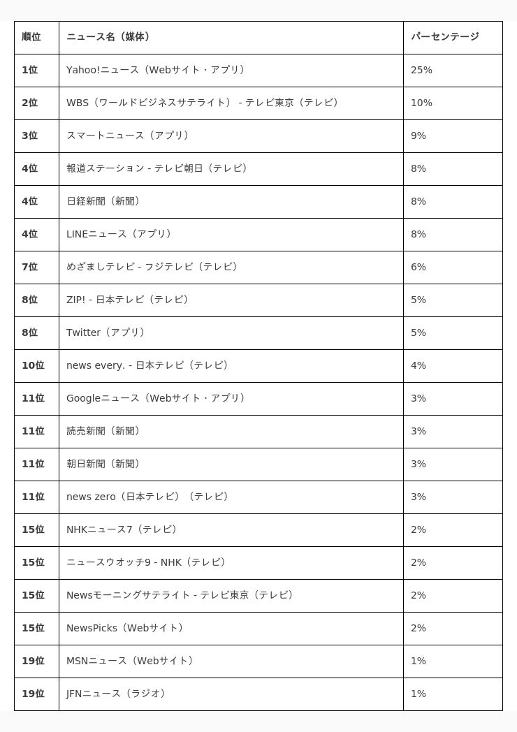 最も高い割合を占めていたのは「Yahoo!ニュース」で、全体の25%にのぼります。