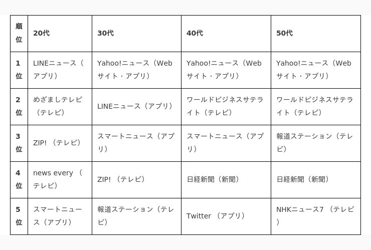 一方、「新聞」は14%、「雑誌」は1%に留まっていることから、紙媒体でニュースを見る人は少ない傾向にあります。