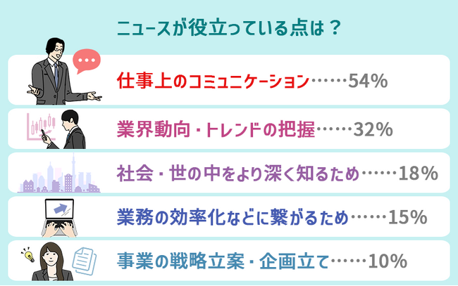 ニュースがどのような点で役立っているかを尋ねたところ、最も多かった回答は「仕事上のコミュニケーション」で、全体の半数以上を占めていました。次に多かった回答は「業界動向・トレンドの把握」で32%という結果になっています。