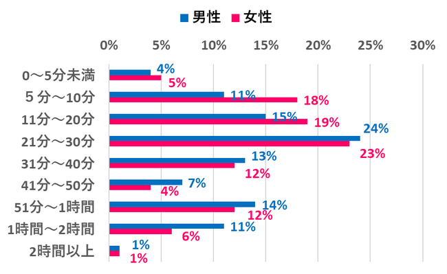 「1日にニュースを見る平均時間」男女別の分布