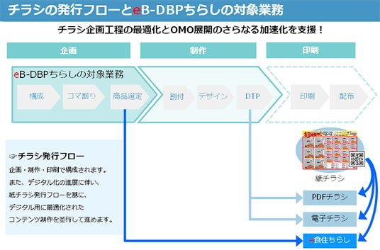 「eB-DBPちらし」は主に「企画」工程と、一部「制作」工程を対象とし、チラシ企画プロセスの最適化とOMO展開のさらなる加速化を支援します。