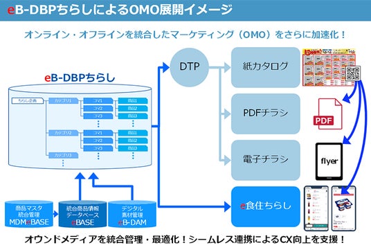 「eB-DBPちらし / e食住ちらし / e食住なび」は、現在各社が取り組むオンライン・オフラインを統合したマーケティング(OMO)をさらに加速化し、複数チャネルのオウンドメディアを統合管理、最適化し、シームレスな連携によるCX向上を支援します。