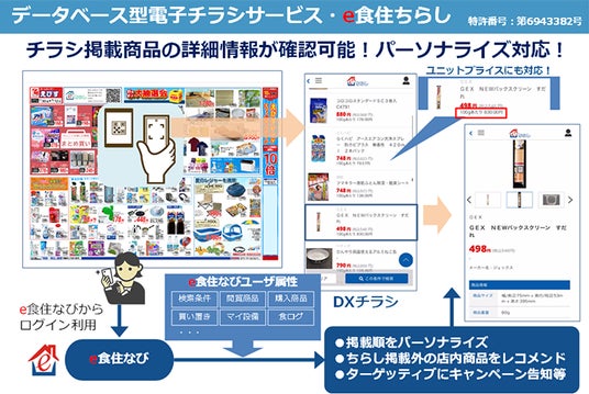 ※「e食住ちらし」は「料理レシピ」連動等の新しい購買体験を提供できるだけでなく、自治体の条例で推奨されている100g単位当たりの価格表示「ユニットプライス」にも対応しています。