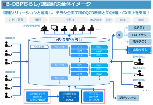 「eB-DBPちらし / e食住ちらし / e食住なび」は、紙チラシの強みを活かしながら、「電子チラシ(デジタルチラシ)連携」、「商品検索サイト型Webサイト連携」、及び「CXソリューション連携(料理レシピ連動等)」の各機能を強化しており、紙媒体とデジタルのシームレスな統合、柔軟なマーケティング戦略の推進を支援たします。