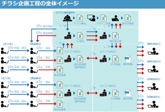また、チラシ企画業務は、チラシ構成の検討から、レイアウト案作成、商品選定、割付・レイアウト指示作成等のステップを要し、これらのプロセスは、時間がかかるだけでなく、複数の部門や外部の協力者が連携、調整を進めながら進行するため、効率性やコストの面で多くの課題が存在します。