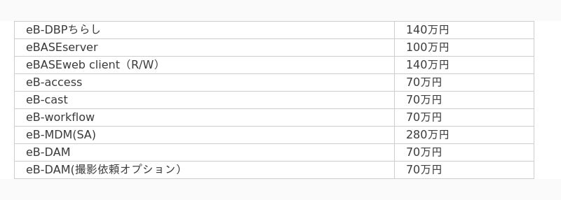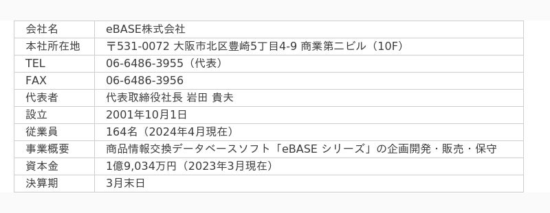 eBASE株式会社は商品情報に関わるデータベースソリューションパッケージソフトであるeBASEjr、eBASEstandard、SmalleBASEserver、eBASEserver等の幅広いラインナップにより、生産者・原材料メーカー、加工メーカー、卸会社、小売会社の業態や規模にフィットしたソリューションを提供することが可能な商品情報交換データベース分野のエキスパート企業です。eBASE社の各種パッケージソフトウェアはシームレスに連携やアップグレードが可能です。商品情報に関わる様々な業務アプリケーション(「MDM eBASE」、「PDM eBASE」、「FOODS / GOODS eBASE」等)との連携を高いコストパフォーマンスで実現します。 eBASE社は様々な業界(食品、日雑、医薬、文具、家電、工具、環境、住宅、アパレル等)で培った商品 情報交換ソリューションノウハウを「全体最適」の視線で継続提供いたします。又、パッケージソフトウェアビジネスに加えて、その商品情報コンテンツビジネスとして商品データプールサービス「商材えびす(食材 / 外食 / 日雑 / 住宅 / 家電 / 文具 / 工具(小売版) / 工具(卸版) 等)」を提供しています。更にこれら商材えびすデータを活用した消費者向けアプリビジネスとして、あらゆる商品カテゴリを統合したライフスタイルアプリ「e食住なび」、「e食住カタログ」、「e食住ちらし」、「e食住ビジュアルレシート」、及び住まいの設備や家電の情報をまとめて管理できるアプリ「e住なび」、等、幅広く小売企業を経由して一般消費者ユーザーに提供しています。