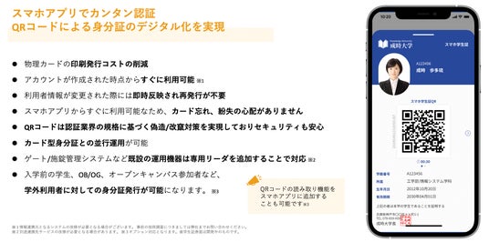 「スマホ学生証」の導入によって、学生サービスの向上、学内業務の効率化や負荷の改善が期待されています。今年度はカード型と併用した運用を行い、将来的には「スマホ学生証」ヘの一本化が計画されています。