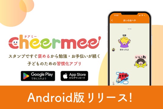 株式会社スタート・イノベーション(所在地:東京都渋谷区、代表取締役社長:池田慈生)は、褒めるスタンプで子どもの勉強やお手伝いが習慣化するアプリ「Cheermee(チアミー)」のAndroid版をリリースいたしました。Android版でも、先行してリリースされたiOS版と同じ機能をお使いいただけます。