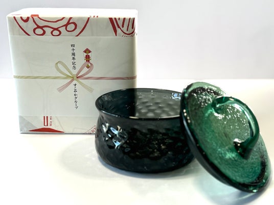 ▼記念品:琉球ガラスの「すこやかオリジナル薬入れ」