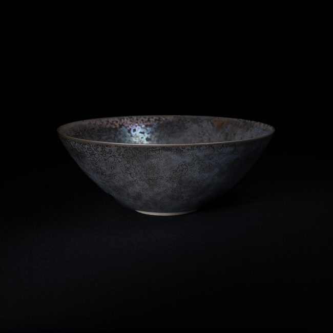 薄くて手取りのいいbowl。 土も特別に作った丈夫な素材です。光にかざすと結晶が色々な色に輝きます。金属質の侘びた黒、七色に光る煌めき、相反する陰と陽を共存させた釉薬です。黒(音: コク) 色の一つで、無彩色です。
