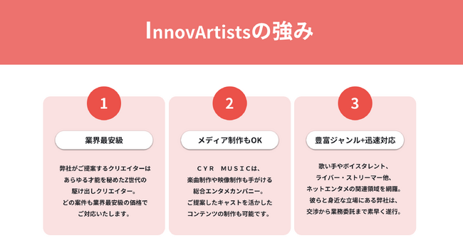 CYR MUSIC合同会社(本社:北海道登別市、代表社員CEO:佐藤 伶於)は、駆け出しのネットクリエイター起用に特化したキャスティングサービス「InnovArtists」https://www.cyrmusic.com/casting をローンチしたことをお知らせいたします。