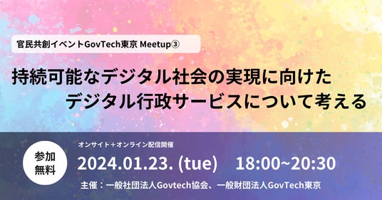 一般社団法人Govtech協会(代表理事:日下光、伊藤 和真)は一般財団法人GovTech東京(代表理事:宮坂 学)との共催イベント「官民共創イベントGovTech東京 Meetup3.~持続可能なデジタル社会の実現に向けたデジタル行政サービスについて考える~」を2024年1月23日(火)18:00より開催いたします。