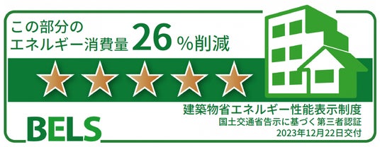 また、環境貢献取組の一環として、断熱性能の確保や、節湯水栓、潜熱回収型給湯器等の採用により、建築物省エネルギー性能表示制度(BELS※4)にて最高ランクの★5を取得しております。