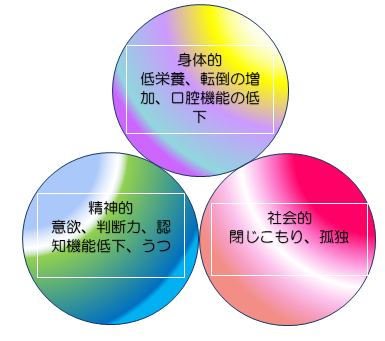 フレイルは,要介護状態に至る前段階として位置づけられるが,身体的脆弱性のみならず精神心理的脆弱性や社会的脆弱性などの多面的な問題を抱えやすく,自立障害や死亡を含む健康障害を招きやすいハイリスク状態を意味する。」