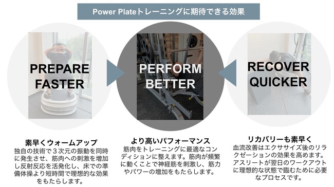 Power Plateを使用することにより、短時間で効率的に・安全にウォーミングアップをすることは「持続可能なトレーニング」を実現する為には必要不可欠です。