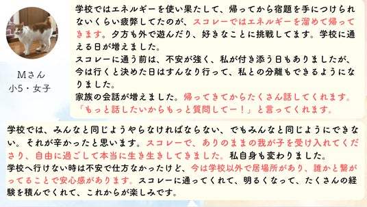 「前は、学校での出来事を聞いても全く話してくれなかった。スコレーに行ってから、帰りの車でおしゃべりがとまらない」