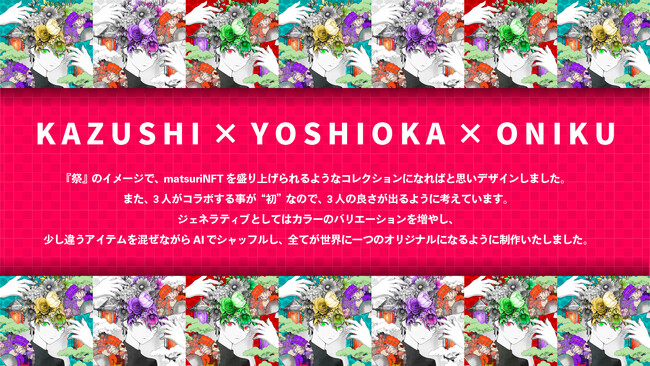就任したプロデューサー カズシ フジイ氏、アンバサダーであるYoshioka氏、ONIKU氏のクリエイター3名によるコラボレーションNFTの開発も進んでおり、今までにないコラボレーションや共同作品・コレクションなどの企画なども積極的に行ってまいります。