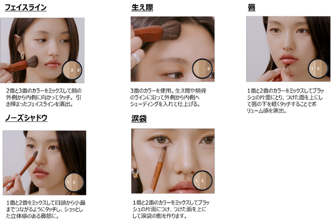 自然なグラデーションでフェイスラインをすっきり見せることはもちろん、生え際に入れたり、ノーズラインや唇に立体感を演出したり、涙袋の影を作るなど、幅広い用途でご活用いただけます。