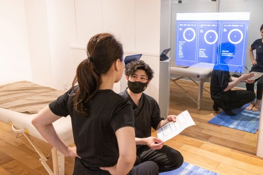 理学療法士が独自開発した日本で唯一のプログラムで、身体の本質的な課題を数値ベースで見える化。最新技術のミラーディスプレイも導入し、施術前後で自分の身体がどう変わっていったかも共有します。理想的な数値を目指すべく、一人一人に最適なアプローチを行います。