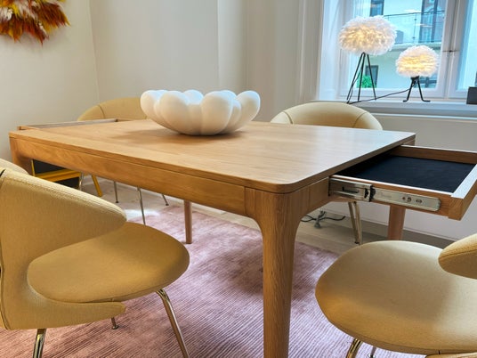 今年2月頃に3daysofdesign訪問を決定し、オフィシャルサイトにて続々とラインナップされてくる400を超えるExhibitorを一つ一つチェックしていく中で、このUMAGEの"Heart'n'Soul Dining Table"に着目した弊社代表が直接メーカーに連絡。是非直に作品を見てお話をしたいとアポイントを取り、この訪問が決まりました。実際に作品を目の前にして、写真で見た印象通りの素晴らしい品質であることを確認。無垢材の角R(角の丸み)の仕上げは丁寧できめ細やか、特に1200mmのサイズは日本の家庭にちょうど良いサイズ。そしてカテラリーを収納できるスリムな引出しに、テーブル下に閉まっておける次ぎ板を乗せるだけで簡単にテーブルを拡張できるシンプルな仕様も素晴らしいものでした。
